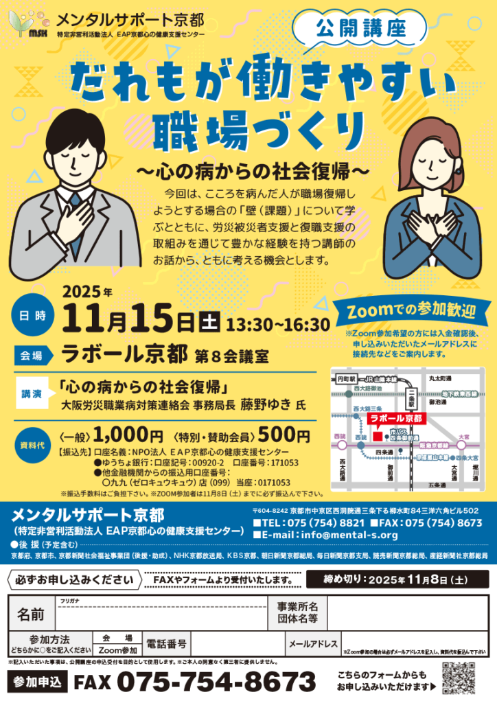 2025年11月15日(土)開催 公開講座 「 だれもが働きやすい職場づくり~心の病からの社会復帰~ 」 投稿日 2025年10月15日 著者 mentals-99 カテゴリー News 画像クリックでPDFをダウンロードできます 今回は、こころを病んだ人が職場復帰しようとする場合の「壁(課題)」について学ぶとともに、労災被災者支援と復職支援の取組みを通じて豊かな経験を持つ講師のお話から、ともに考える機会とします。 参加申し込みはこちら